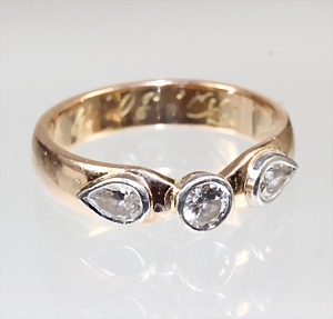Ring, GG 585/000, 1 Brillant ca. 0,15 ct tw/w-si, 2 Diamanttropfen ca. 0,34 ct tw/w-si, alle Steine weiß gefasst, RW ca. 52,5