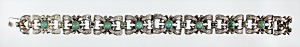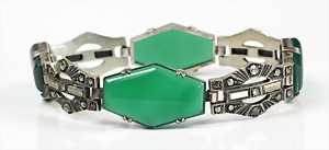 Armband, "ART-DECO" Deutschland 1920/30er Jahre, Silber 925/000, sig.: Germany Sterling, grüner Calcedon, Markasiten, integriertes Kastenschloss, B = ca. 14,5 mm, L = ca. 18,2 cm