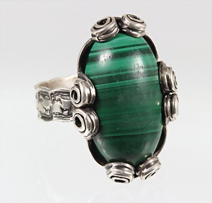 Herren-Ring, Künstlerkolonie "WORPSWEDE", Silber 835/000, signiert: 835 H. V. KLEIST (Helmut von Kleist) HANDARBEIT, 1 Malachitcabochon, Ringkopf: ca 20,5,5 x 31,1 mm, RW ca. 71