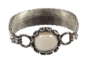 Armreif/Spange, Künstlerkolonie "WORPSWEDE", Silber 835/000, signiert: WORPSWEDE 835 HELMUT V. KLEIST HANDARBEIT, 1 Rauchquarz Cabochon, D = ca. 26,3 mm, Innen: D = ca. 61,3 x 48,5 mm
