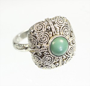 Ring "THEODOR FAHRNER" Pforzheim der 1930/40er Jahre (Filigranschmuck), Silber 925/00, sig.: TF 925 FAHRNER , Türkis, Ringkopf ca. 14,3 x 15,0 mm, Ringschiene ornamentiert, RW ca. 51,5