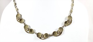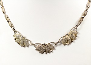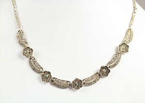 Collier, "THEODOR FAHRNER" Pforzheim der 1930/40er Jahre (Filigranschmuck), Silber 925/00 verg., sig.: ORIGINAL FAHRNER, 5 Türkiscabochons in Blütenrosetten, L = 42,5 cm