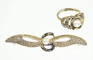 Lot: Ring u. Brosche, "THEODOR FAHRNER" Pforzheim der 1930/40er Jahre (Filigranschmuck), Silber 925/00, verg., Ring, sig.: Fahrner 925 TF, Akoja-Perle, RW ca. 53; Brosche sig.: ORIGINAL FAHRNER TF 925, Markasiten u. Akoja-Perle, L = 58,2 mm, Literatur bei Arnoldsche "THEODOR FAHRNER SCHMUCK", S. 226-229