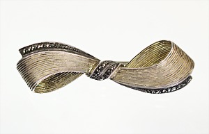 Brosche "SCHLEIFE" von "THEODOR FAHRNER" Pforzheim der 1930er Jahre (Filigranschmuck), Silber 925/00 verg., sig.: ORIGINAL FAHRNER TF 925, seitlich mit Markasiten ausgelegt, L = 48,2 mm, Literatur bei Arnoldsche "THEODOR FAHRNER SCHMUCK", S. 226-229
