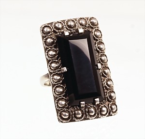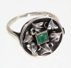 Ring "JUGENDSTIL" um 1915, Silber 835/000 sig.: F (T. Fahrner ?), grüner quadratischer Cabochon, Ringkopf seitlich mit durchbrochenem Mustern, D = 16,0 mm, RW ca. 51