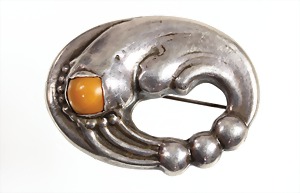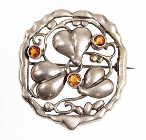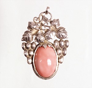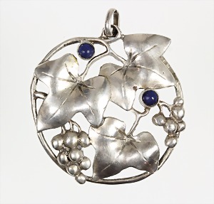 Brosche, Weinblätter mit Trauben, "WILHELM MÜLLER" Pforzheim 1910/20er Jahre, Silber 800/00, sig: WM 800, (umsignierte Brosche von "THEODOR FAHRNER", in Literatur vermerkt !), 2 Lapiscab. H = ca. 41,6mm, B = 36,5 mm, plastisch schön ausgearbeitete Blätter ! Literatur bei Arnoldsche "THEODOR FAHRNER SCHMUCK" S. 145-147