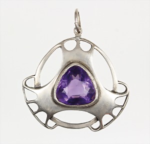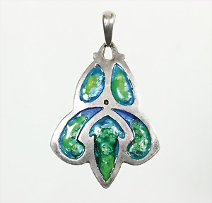 Anhänger, "JUGENDSTIL" um 1910, Silber, unsigniert, wohl Liberty & Charles Horner, transluzides Konteremaille in grünen u. blauen Farbtönen (beidseitig), H = 49,0 mm