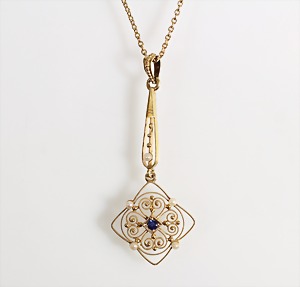 Anhänger "JUGENDSTIL" um 1900, GG 585/000, sig.: Wilhelm Müller Berlin, sehr zarte Drahtarbeit mit zentralem Saphir u. 5 Natur-Perlen, H = 49,5 mm (beweglich gearbeitet); Kette, GG 585/000, kl. Kastenschlößchen, L = 45,0 cm, mit Original-Schatulle !