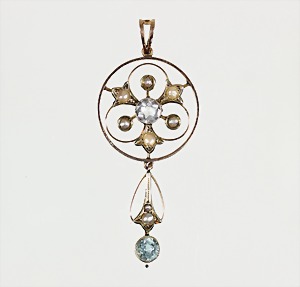 Filigraner Anhänger "JUGENDSTIL", England um 1910, GG 9 ct (375/000), 2 facettierte Aquamarine, 6 St. 1/2 Perlen, H = 48,3 mm