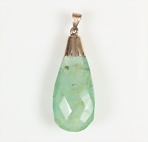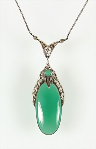 Anhänger/Collier, "ART-DECO" 1920/30er Jahre, Silber 900/000, grüner Calcedon, weißer Strass, Anhänger H = ca. 55,5 mm, L = ca. 42,5 cm