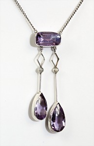 Zartes Collier, "ART-DECO" 1920/30er Jahre, Silber, 3 Amethyste (davon 2 als Tropfen geschliffen) 2 St. 1/2 Perlen, L = 38,0 cm, typische Idar-Obersteiner Arbeit !