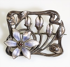 Brosche "JUGENDSTIL" um 1905, Silber 900/000 (DEPOSEÉ), zart emaillierte Blüten, ca. 31,3 x 25,5 mm, typ. Pforzheimer Arbeit ! Emaille mit kl. Fehlstelle