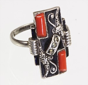 Ring, "ART-DECO" 1920/30er Jahre, Silber 835/000 (Signatur unleserlich), Koralle, Markasiten, schwarzes Matt-Emaille, RW ca. 56,5 Für diesen Artikel ist ein Versand in nicht EU-Länder leider nicht möglich !