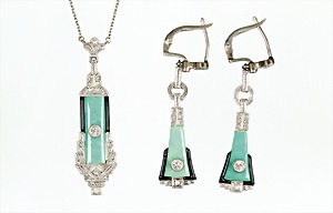 Lot: feines "ART-DECO" um 1920/30, WG 585/000, signiert: WB, 1 Paar Ohrhänger mit 12 Diamanten/Diamantrosen (weiß), H = 38,2 mm; Collier: Anhänger mit 14 Diamanten/Diamantrosen (weiß), H = 38,5 mm, Kette L = 42,5 cm), beide mit graphisch geschliffenem Amazonit und schwarzem Emaille, klassisches art-Deco Design !!
