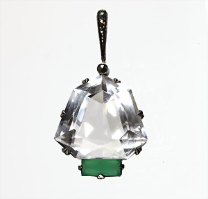 Anhänger "ART-DECO" 1920/30er Jahre, Silber 835/000, facettierter Bergkristall, grüner Calcedon, Markasiten, H = 39,5 mm, schönes Design !