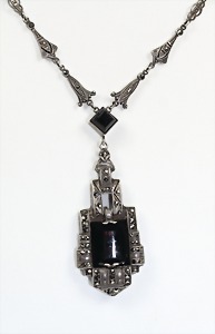 Anhänger/Collier, "ART-DECO" 1920/30er Jahre, Silber 935/000, Onyx, Markasiten, Anhänger H = ca. 64,8 mm, filigrane Kette, L = ca. 48,5 cm, schönes klassisches Art-Deco !