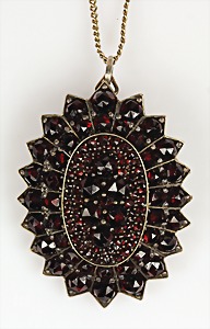 Granat-Anhänger/Medaillon (auch als Brosche tragbar) um 1870/80, Vorderseite mit Granatrosen, Rückseite mit eingeschliffenem Glas, ca. 44,5 x 34 mm; Kette, L = 50 cm
