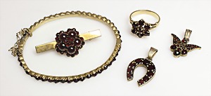 Lot Granatschmuck um 1900/20, 2 Anhänger, H = 22 u 26 mm; 1 Armreif, innen: 55,5 x 47,5 mm; 1 Ring (später) GG 585/000, RW ca. 53, (3 Steine fehlen !)