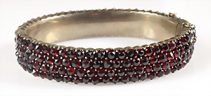 Granat-Armreif um 1900, Metall: weißfarben, 4 Reihen Granatrosen, Kastenschloss mit Sicherheitskettchen, B = 12,7 mm, innen: 56 x 47 mm