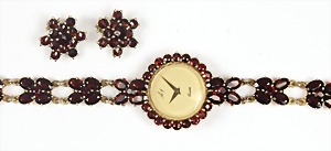 Lot Granatschmuck Mitte 20. Jhd., 1 Uhr, Quarz, Silber (verg.) 925/000, Kastenschloss, L = 18 cm; 1 Paar Ohrclips "STERN", goldfarben, D = 16,2 mm