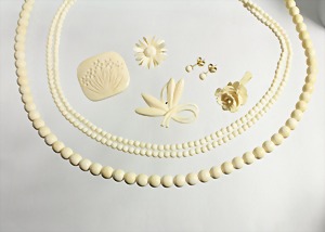 Lot Elfenbein: 1 Paar Ohrstecker mit goldfarbenen Brisuren; 3 Broschen; 1 Rosen-Anhänger; 1 Kette (dünn) D = 4,2 mm, L = 120 cm; Kette (dick) D = 8,0 mm, L = 69 cm, beide mit Drehschlösschen Für diesen Artikel ist ein Versand in nicht EU-Länder leider nicht möglich !