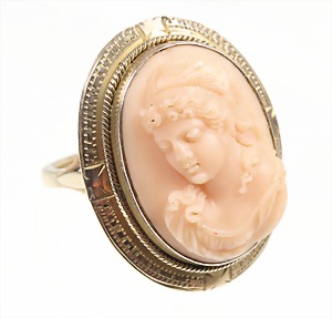 Ring, England um 1850/70, GG 9 ct, geschnittene Koralle, (Damenportrait nach links), plastisch schön ausgearbeitet, Ringkopf: ca. 23,2 x 28,5 mm, RW ca. 55 Für diesen Artikel ist ein Versand in nicht EU-Länder leider nicht möglich !