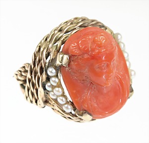 Ring, GG 585/000 (geprüft), geschnittene Korallen-Gemme (Damenportrait), plastisch ausgearbeitet, seitlich 14 St. 1/2 Perlen, Ringkopf aus kordierten Drähten, ca. 20,5 x 23,0 mm, RW ca. 56, total 11,1 g Für diesen Artikel ist ein Versand in nicht EU-Länder leider nicht möglich !