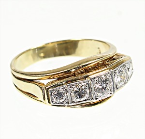 Ring 1920/30er Jahre, GG 585/000, 5 Brillanten ca. 0,65 ct tw-vvsi, (im Verlauf, weiß gefasst), seitlich durchbrochen gearbeitet, RW ca. 55,5