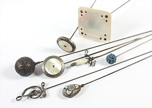8 Hutnadel um 1900-1930, Metall/Silber, u.a. Notenschlüssel, Mikromosaik, Perlmutter mit Steinen besetzt ….und mehr, L = 7,8-27,0 cm