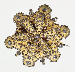Eisenbrosche Mitte 19.Jhd., "BLÜTE", Eisen feuervergoldet, punktförmige Eisenköpfe zieren die Oberfläche, D = ca. 38,0 mm
