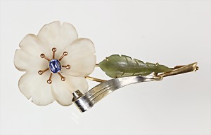 Brosche "BLÜTE", Mitte 20.Jhd., GG/WG 585/000, fein geschnittene Bergkristallblüte (Idar-Oberstein), Ceylon-Saphir, geschnittenes Blatt (Russische Jade ?), ca. 63,0 x 29,1 mm