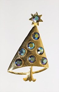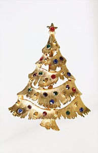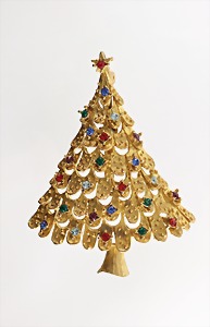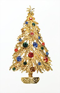 Goldfarbene Weihnachtsbaumbrosche mit farbigen Strasssteinen. Signiert JJ (=Jonette Jewelry, USA), ca. 58 x 44 mm