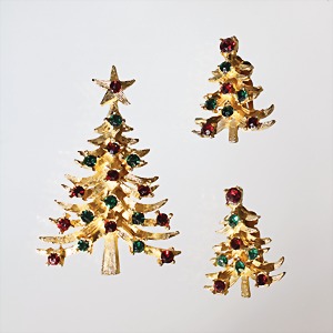 Set: kleinere Weihnachtsbaumbrosche und Ohrclips mit roten und grünen Strasssteinen. Signiert Mylu, Brosche ca. 50 x 35 mm, Clips ca. 29 x 22 mm