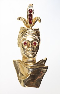Brosche "AFRIKANER", goldfarben, plastisch ausgearbeiteter Kopf mit Kopfschmuck, mit rotem Steinbesatz verziert, H = 76,2 mm