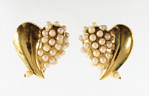 Herzförmige Kunstperlen-Ohrclips signiert ESCADA. Goldfarbenes glänzendes Metall, ca.28 x 27 mm