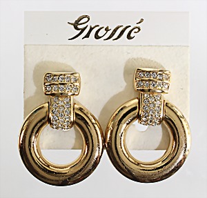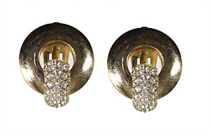 Goldfarbene Ohrclips von Grossé (Henkel und Grosse Pforzheim). Mit klarem Strassbesatz und kreisrunder Abhängung, ca. 38 x 29 mm