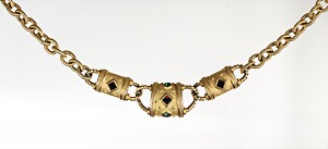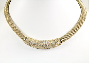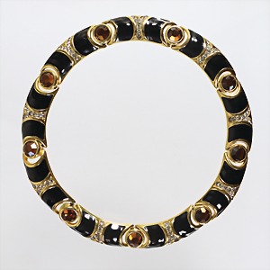 Massives, goldfarbenes Kragen-Collier, signiert.: Daria mit Copyrightzeichen, schwarze Emaille-Oberfläche, runde cognac-farbene Glassteine (facettiert), klarer Strass, B = 16,0 mm, D = 11,0 cm