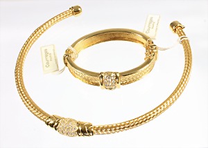 Goldfarbenes Set aus Halsreif und Armspange von Courrèges Paris mit Original-Etikett. Massive Ausführung. Oberfläche in Flecht-Optik. Mittelteil jeweils mit klarem Strassbesatz. Neuwertiger Zustand, Reif D = 12,5 mm, Spange Innen ca. 60 x 42 mm