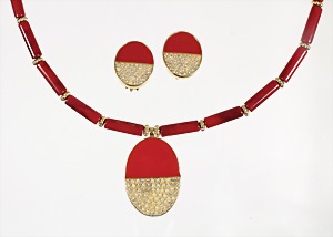 Rotes Set aus Ohrclips und Collier von GIVENCHY (sig.), Anhänger und Clips mit klarem Strassbesatz und goldfarbener Fassung, Collier L = ca. 49 cm, Anhänger ca. 45 x 29 mm, Clips ca. 25 x 20 mm