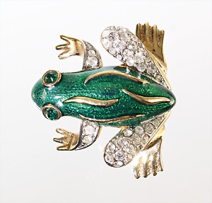 Kleinere, plastisch geformte Brosche in Form eines Frosches mit klarem Strass und grüner Emaille-Auflage von Atwood & Sawyer, England ( sig. A&S ), ca. 26 x 28 mm