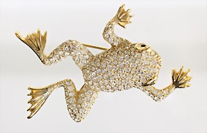 Goldfarbene Brosche, von Grossé in Form eines Frosches (Henkel und Grosse Pforzheim )) signiert. Fein gearbeitet mit klaren Strasssteinen und dunklen Strassaugen, ca. 54 x 36 mm