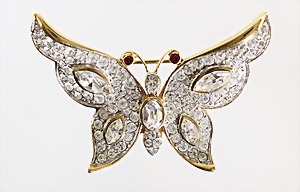 Goldfarbene Brosche mit üppigen Strassbesatz in Form eines Schmetterlings von Atwood & Sawyer (sig. A&S), ca. 47 x 33 mm
