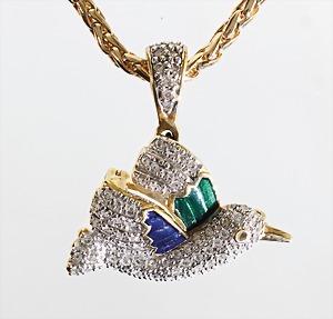 Glänzend, goldfarbene Schlangenkette mit einem Vogel-Anhänger, besetzt mit klarem Strass und blauen und grünen Emaille-Einlagen. Signiert EX, L = 45 cm, Anhänger ca. 35 x 35 mm