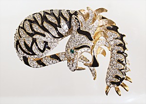 Imposante, goldfarbene Brosche von Atwood & Sawyer, England (signiert A&S) in Form eines Tigers. Klarer Strass, schwarze Emaille-Auflage, plastische Form, ca. 72 x 37 mm