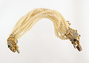 Zwölfreihiges Kunstperlen-Armband mit goldfarbenen, strassbesetzten Pantherköpfen als Schließe. Von Kenneth J. Lane, New York (sig. K.J.L.), L = ca. 20,5 cm