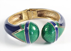 Goldfarbene, eingefasste Armspange mit blau-grüner Emaille-Auflage von CINER, USA (signiert), Innen = ca. 49 x 42 mm