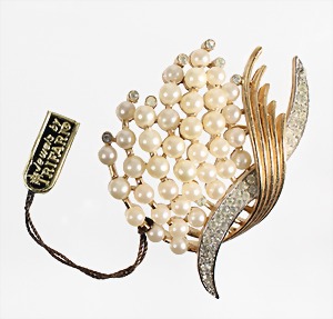 Goldfarbene Kunstperlenbrosche von TRIFFARI, USA. Florale Ausführung mit klarem Strassbesatz. Signiert und mit Original-Etikett, ca. 53 x 38 mm