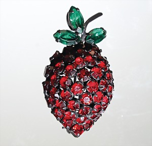 Erdbeer-Brosche von WARNER, USA (signiert). Rot und grüne Strasssteine eingefasst in geschwärztes Metall, ca. 44 x 26 mm