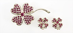 Set von Sarah Coventry, USA. Silberfarbene Brosche und Ohrclips in Form einer Blume/Kleeblatt (signiert). Pinkfarbene Strasssteine, Brosche ca. 79 x 45 mm, Clips ca. 25 x 23 mm