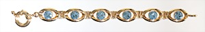 Elegantes, goldfarbenes Armband mit runden, hellblauen Strasssteinen, signiert mit einer Krone. Schwere Ausführung, L = ca. 18 cm